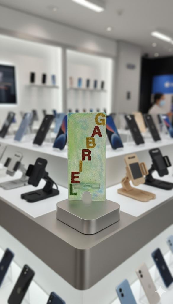 Un porta mĂłvil o tablet con diseño artĂstico y nombre personalizado, creado a mano con resina artesanal y pigmentos perlados.