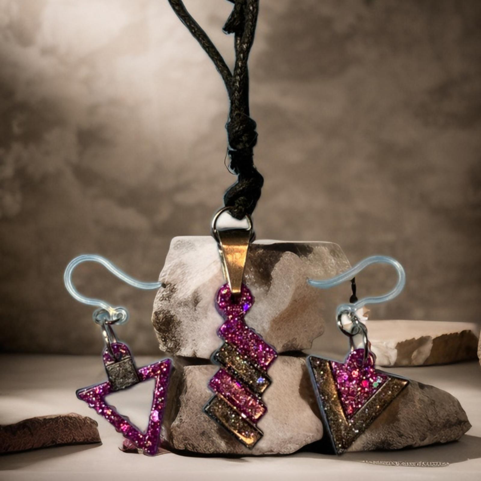 Creado a mano con resina artesanal, este conjunto combina la energĂa de las formas geomĂ©tricas con el brillo profundo de los tonos pĂşrpura y bronce.